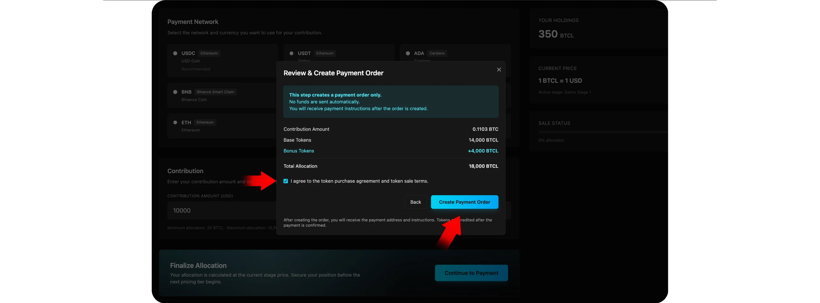 Review the displayed allocation and token price